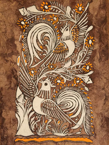 Aztec Birds, Original Painting on Amate Tree Bark, Vintage, Early 1970's